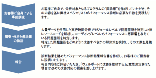 | 診断結果は、 「実行時間分析をグラフで記載する」 「ソースコードのリストに該当箇所に改善案を記述する」等 分かり易く報告いたします。 |
